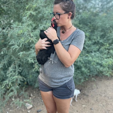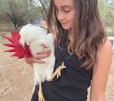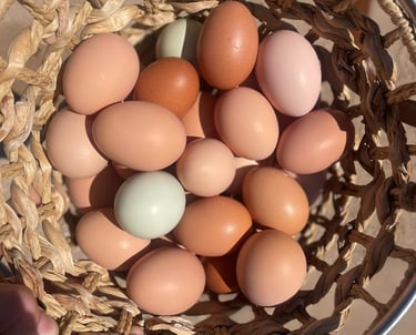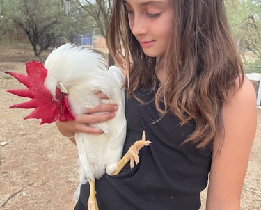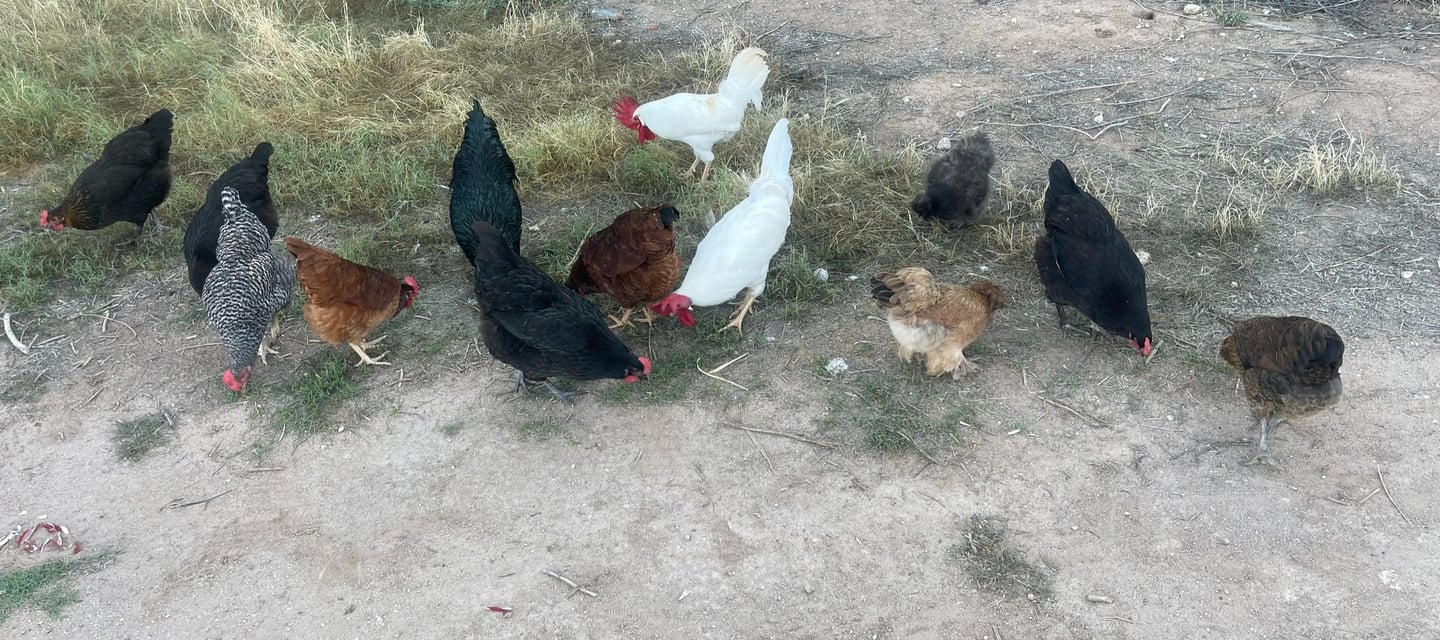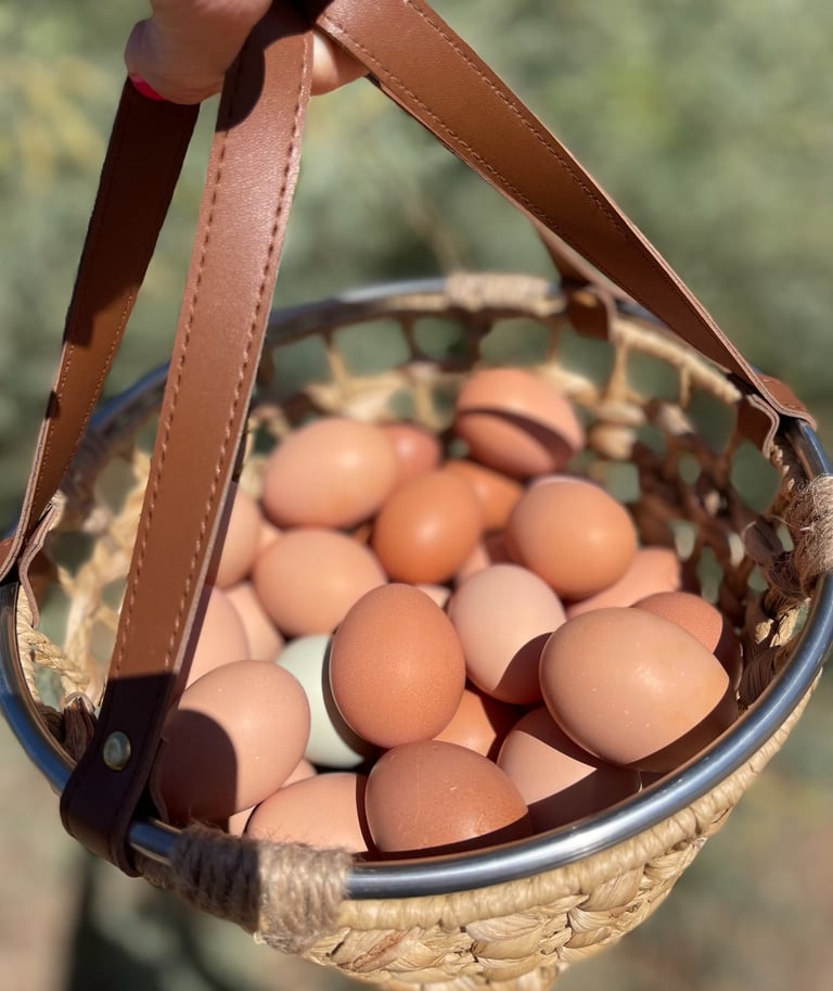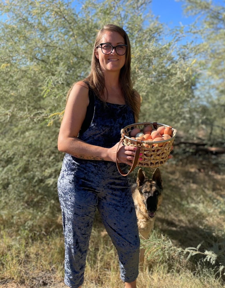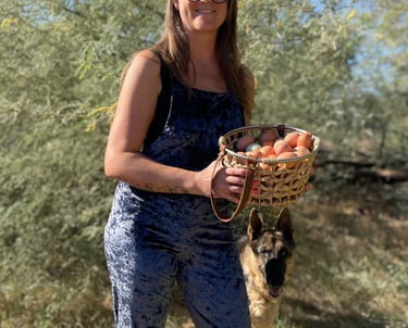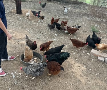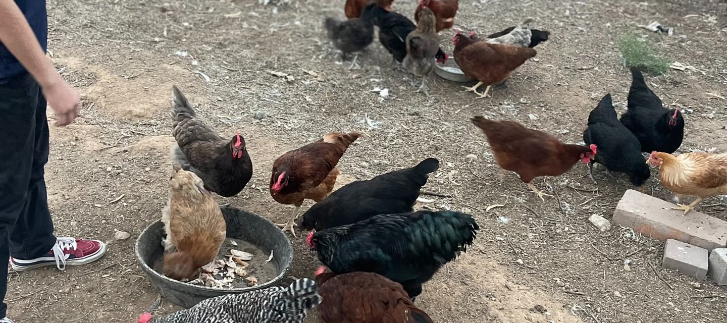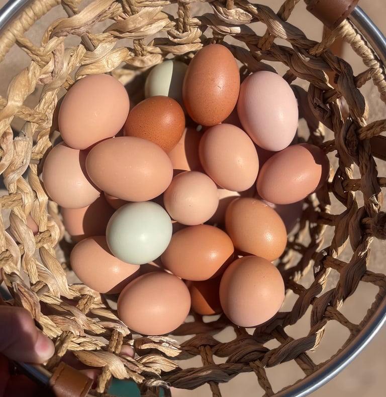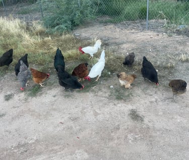Being a lover of all animals and walks of life, we began sourcing and handpicking our ideal flock from private sellers. Basing our search on temperaments, how well they can handle the heat, their needs, and the most fun part, what color eggs they will lay! To actually "taste the rainbow" was my goal. We've raised our flock of over 40 chickens from chicks and receive immense joy hearing from the little raptors in our backyard throughout the day. There's many that love to snuggle, and we can't help but kiss them on their little combs a million times. These chickens are very loved! They are strictly our pets and companions and get to free range our property from sunrise to sunset and only eat organic feed.
